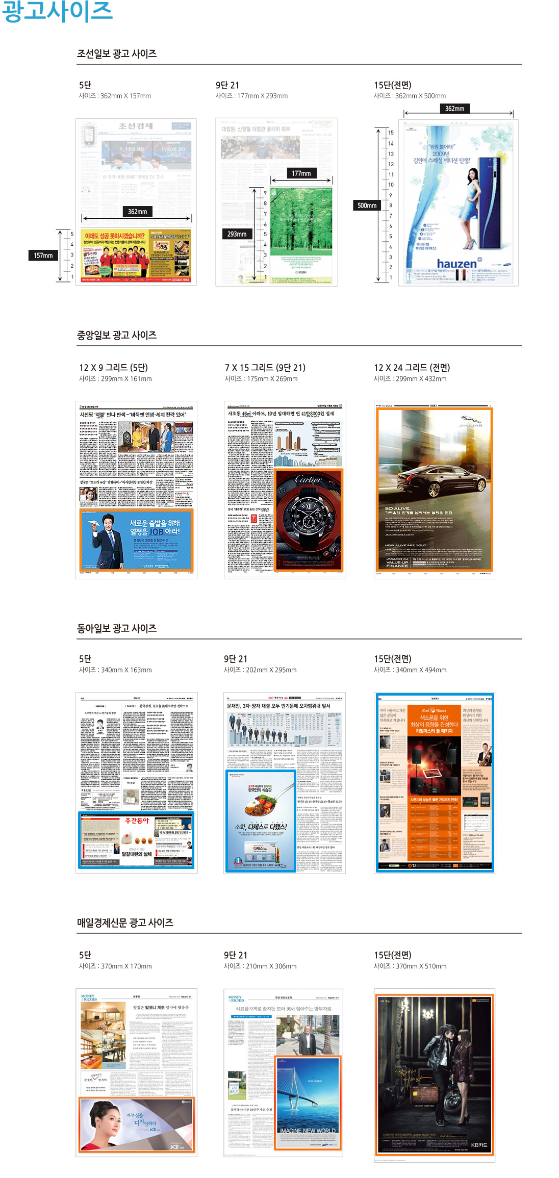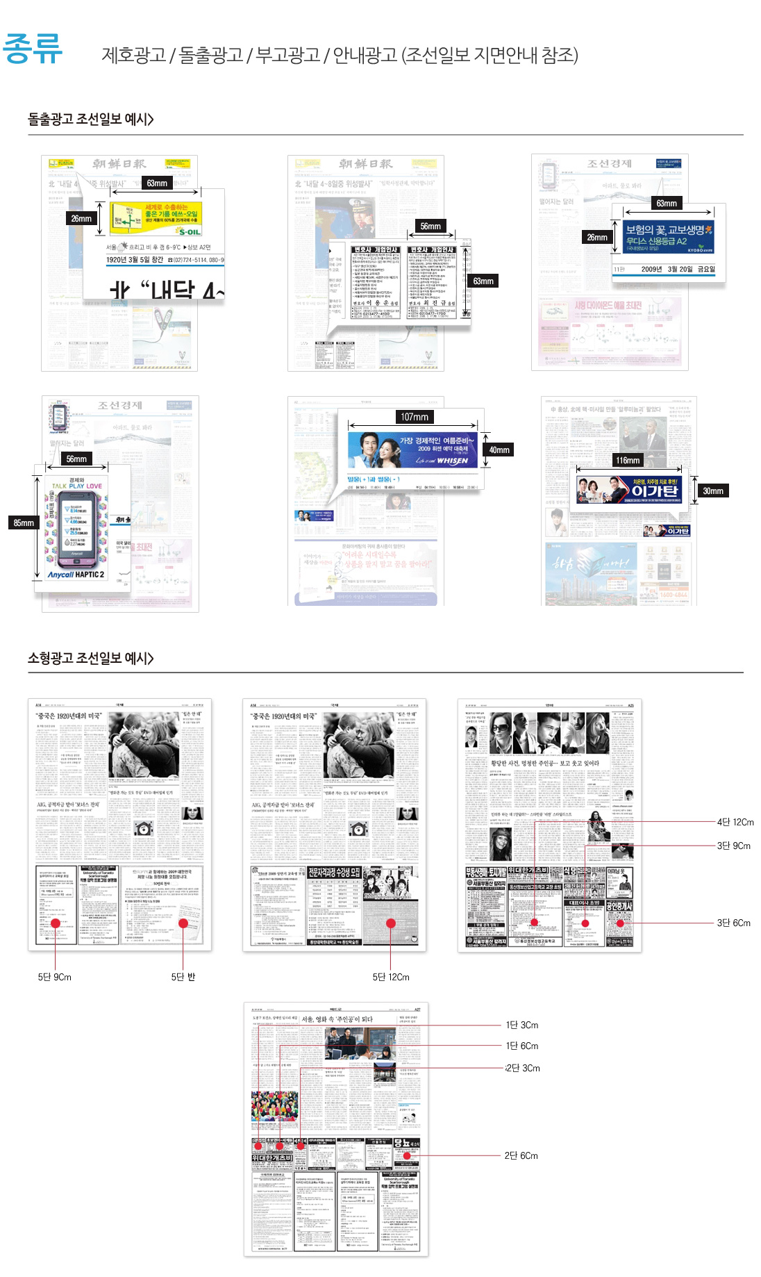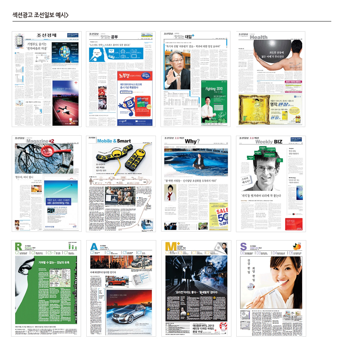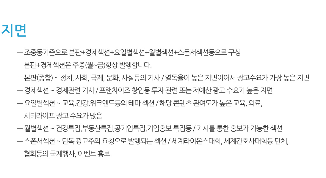 ㅡ 조중동기준으로 본판+경제섹션+요일별섹션+월별섹션+스폰서섹션등으로 구성 본판+경제섹션은 주중(월~금)항상 발행합니다. ㅡ 본판(종합) ~ 정치, 사회, 국제, 문화, 사설등의 기사 / 열독율이 높은 지면이어서 광고수요가 가장 높은 지면