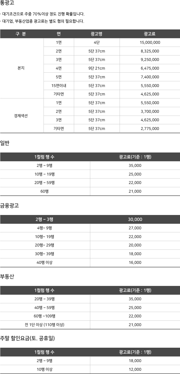 계산법 예2) 5단 통광고 : 5단 x 37cm x 50,000원(단가) = 9,250,000 원